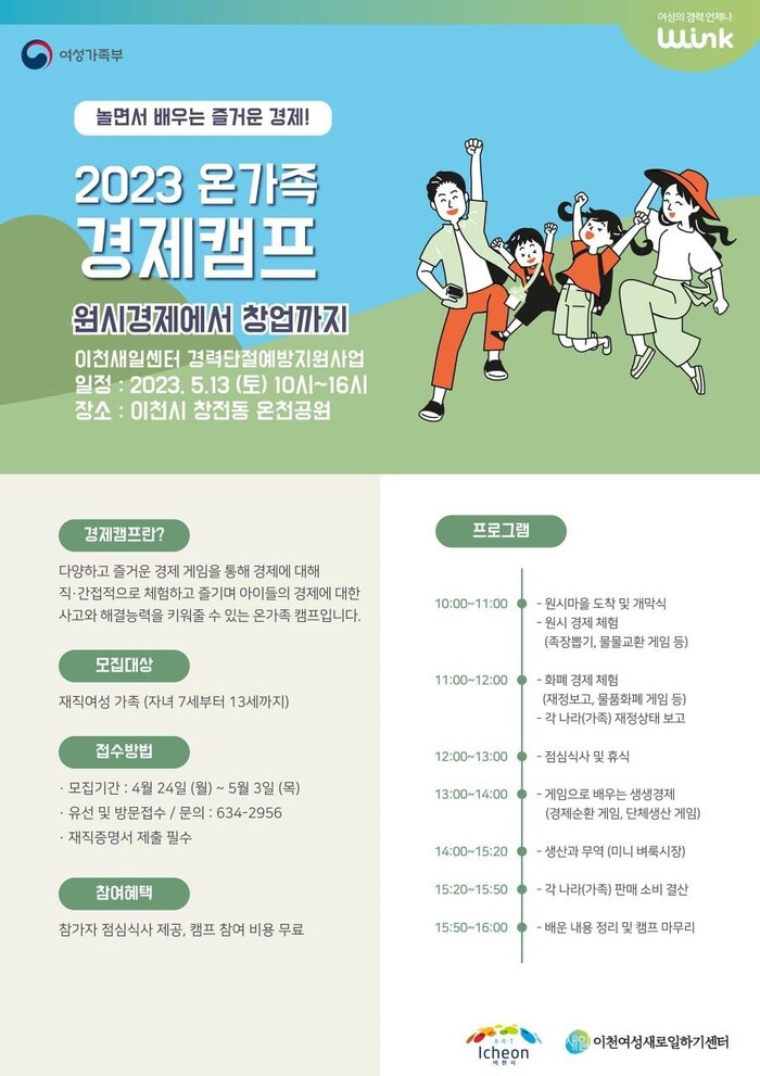 [로컬세계=김병민 기자]경기 이천여성새로일하기센터(이하 이천새일센터)는 5월 가정의 달을 맞이해 재직 여성과 그 자녀(7살~13살)를 대상으로 한 온가족 경제캠프 ‘원시경제에서 창업까지’를 5월 13일 토요일 오전 10시 온천공원에서 개최한다.