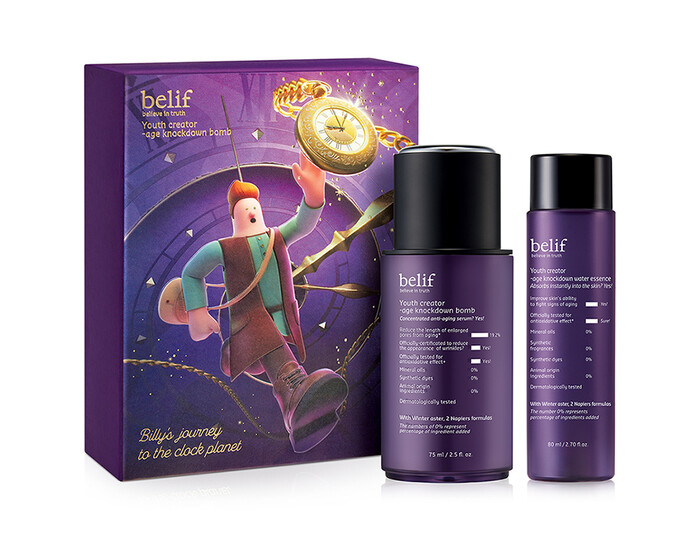 또한 시간과 중력을 거스르는 안티에이징 제품의 특성을 빌리프만의 재치 넘치는 일러스트로 패키지 디자인에 녹여내 소장가치를 더했다. 빌리프 세계관 속 주인공 ‘빌리’가 영험한 힘이 담긴 자수정을 찾아 clock planet으로 향하는 모험의 한 장면을 담았다.