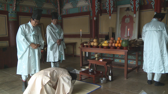 ▲28일 전남 여수 충민사에서 이순신 장군의 탄신제가 열린 가운데 한 관계자가 절을 올리고 있다. |