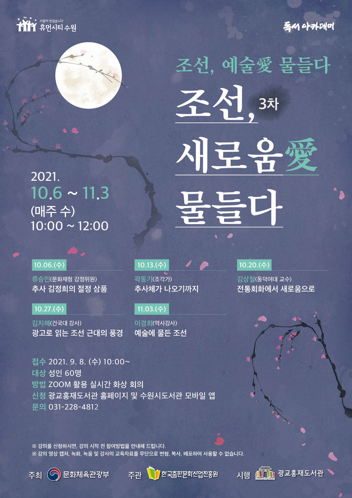 관심 있는 시민은 오는 8일부터 광교홍재도서관 홈페이지 ‘통합예약/신청→독서문화프로그램’에서 ‘조선, 예술愛(애) 물들다: 3차 조선, 새로움愛(애) 물들다’를 선택해 신청하면 된다. 수강생은 문자로 온라인 링크를 안내받아 수업에 참여할 수 있다.