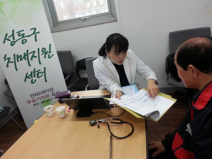 ▲성동구 치매지원센터 의료진이 기억력 검사를 진행하고 있다. |