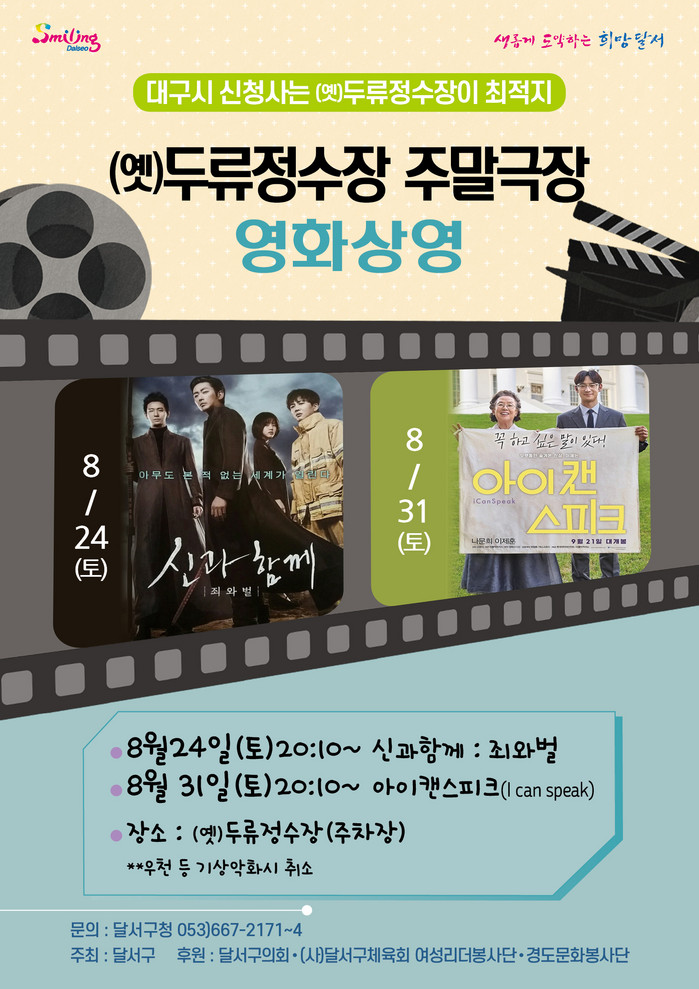 영화상영은 옛 두류정수장 주차장에서 오는 24일과 31일 오후 8시 10분부터 10시 30분까지 상영되며 관람료는 무료다.