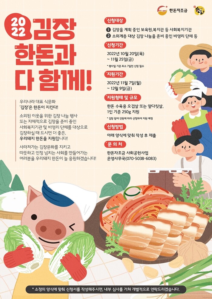 내부 심사를 통해 선정된 기관 및 단체 등에는 김장 김치와 찰떡궁합을 자랑하는 우리돼지 한돈(수육용)을 참여 인원수에 맞춰 한돈 수육 레시피 등과 함께 제공할 예정이다. 신청 기간은 금일부터 오는 11월 25일까지이며, 지원 기간은 11월 7일부터 12월 9일까지다.