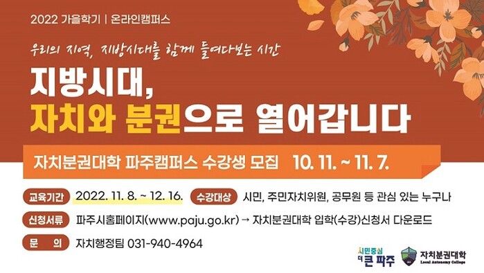 [로컬세계 = 이영원 기자]경기 파주시(시장 김경일)는 새롭게 열릴 지방시대를 맞아 ‘자치분권대학 파주캠퍼스 2022년 가을학기’를 개설한다.