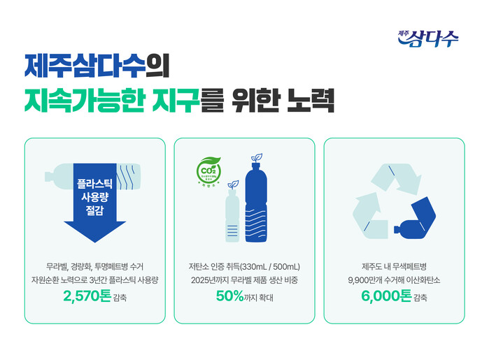 친환경 제품 확대뿐만 아니라 제주삼다수는 지난 2003년부터 제주삼다수 용기 경량화를 지속적으로 진행해왔다. 지난해에는 330mL와 500mL 제품의 용기를 추가로 경량화해 환경부로부터 저탄소 제품 인증을 취득한바 있다.