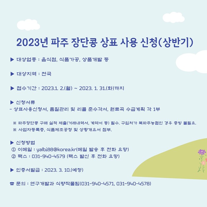 상반기 파주장단콩 상표사용 신청 대상은 2023년 상반기 인증 기간이 만료되는 43개소 및 파주장단콩 상표 사용과 전문점 지정을 희망하는 신규 업체로, 파주장단콩을 원료로 사용하는 음식업 및 가공업 등을 운영하는 업체여야 한다.
