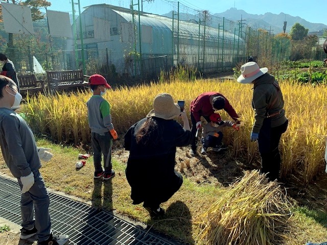 ▲지난해 강감찬텃밭에서 진행한 벼추수체험 프로그램(벼베기 활동) 모습. 관악구 제공 |