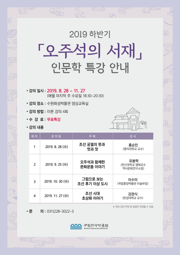특강은 오는 28일부터 11월 27일까지 매달 마지막 주 수요일 저녁 6시 30분 수원화성박물관 영상교육실에서 진행된다.