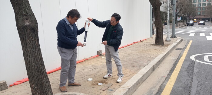 ▲ 일산동구 백석동 인근 공사현장에 지반침하 감지기를 설치하고 있다. 고양시 제공 |