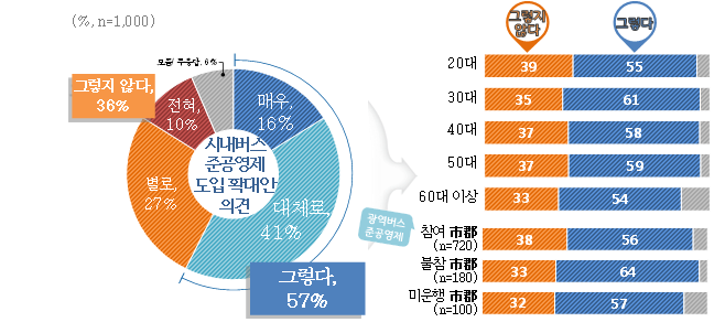 아울러 광역버스 준공영제 추진 이후 ‘시내버스’까지 준공영제 도입을 확대해야 하는지에 대한 물음에도, 57%의 도민들이 찬성하는 것으로 조사됐다.