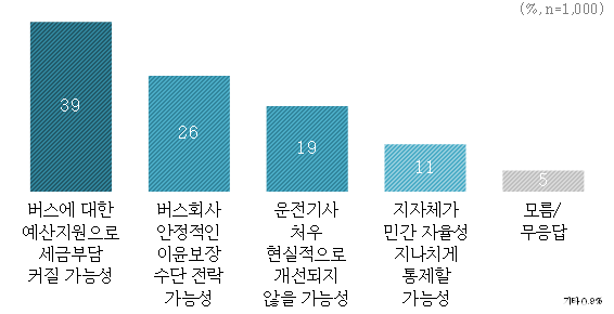 반면, 버스 준공영제 추진 시 우려 사항으로는 ‘세금부담이 커질 가능성’(39%)이 가장 높게 나타났고, ‘버스회사의 안정적 이윤보장 수단으로 전락할 가능성’(26%)이 뒤를 이었다.