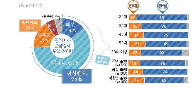 특히 지역별로는 준공영제 참여대상 22개 시‧군 주민의 경우 76%가, 성남.고양 등 현재 불참 의사를 밝힌 지역의 주민 74%도 찬성한다고 응답했다.
