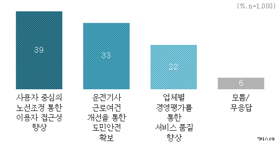 버스 준공영제가 추진될 경우 기대되는 점으로는 ‘사용자 중심의 노선조정을 통한 이용자 접근성 향상’(39%)과 ‘운전기사 근로여건 개선을 통한 도민안전 확보’(33%)가 각각 높게 꼽혔다.