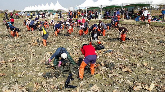 연근캐기 체험행사는 당일 오후 1시부터 3시까지 사전 예약한 300여명의 신청자와 함께 열리며 체험비(성인 5000원, 중고생 3000원, 초등생 이하 2000원)는 당일 납부하고 개인별 10kg 이하까지 수확해 가져갈 수 있다.