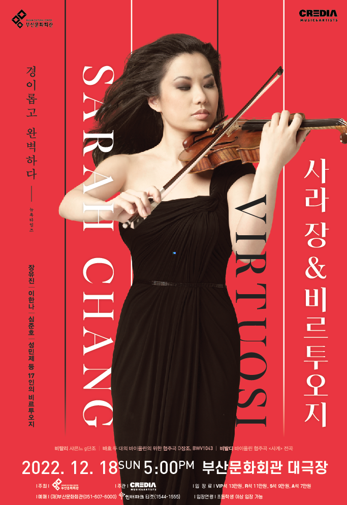 [로컬세계 = 손영욱 기자](재)부산문화회관은 슈퍼스타 바이올리니스트 사라 장과 젊은 거장들의 공연인 '사라 장 & 비르투오지'를 초청해 오는 12월 18일에 부산문화회관 대극장에서 개최한다.