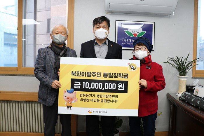 한돈자조금은 지난 2016년부터 일가재단과 북한이탈주민에게 꾸준히 장학금을 지원하며 한돈농가들의 응원의 마음을 전달하고 있다. 올해도 일가재단 통일장학위원회의 추천을 받아 선발된 대학생 2명에게 각 500만원씩 총 1,000만원을 전달했다.