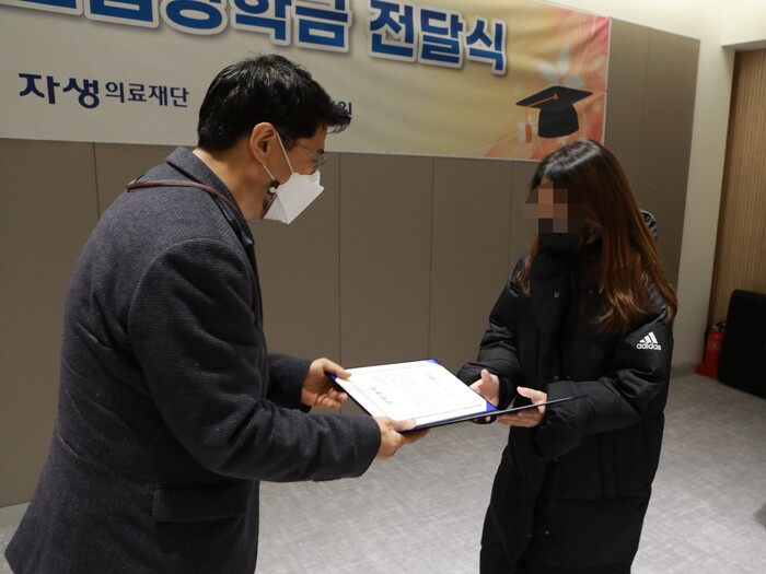 ▲자생의료재단 신민식 사회공헌위원장이 지역 저소득 청소년에게 장학금을 전달하고 있다. |