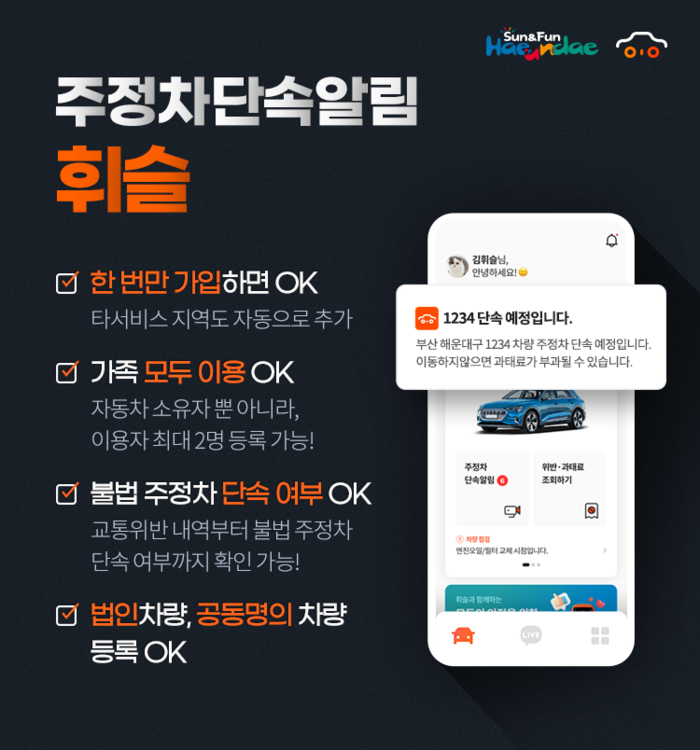 지난 17일부터 시행한 전국 통합서비스인 ‘휘슬’에 가입하면 해운대를 비롯해 전국 지자체의 주ㆍ정차단속 알림 서비스를 받을 수 있다.