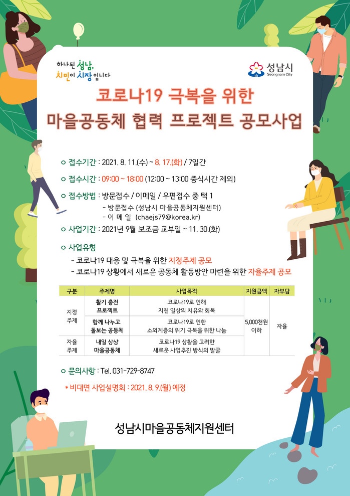 [로컬세계 김병민 기자]경기 성남시는 코로나19 극복을 위한 마을공동체 협력 프로젝트 공모사업을 진행한다고 9일 밝혔다.