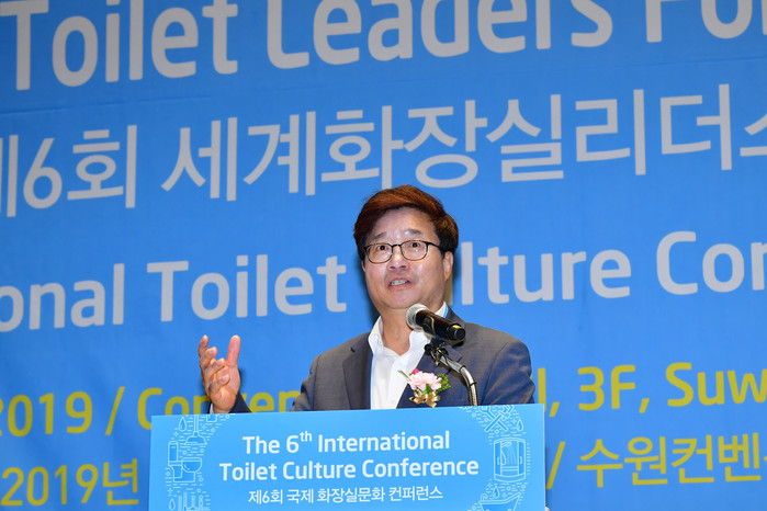 | ▲염태영 세계화장실협회장(수원시장)이 지난 6월 수원컨벤션센터에서 열린 ‘제6회 국제화장실문화 콘퍼런스’에서 개회사를 하고 있다.(수원시 제공) |