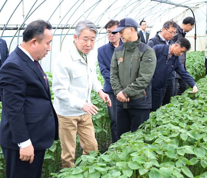 ▲강호동 농협회장(왼쪽에서 두번째)이 대구 깻잎 농가를 찾아 생육 부진 피해를 점검하고 있다. 농협 제공 |