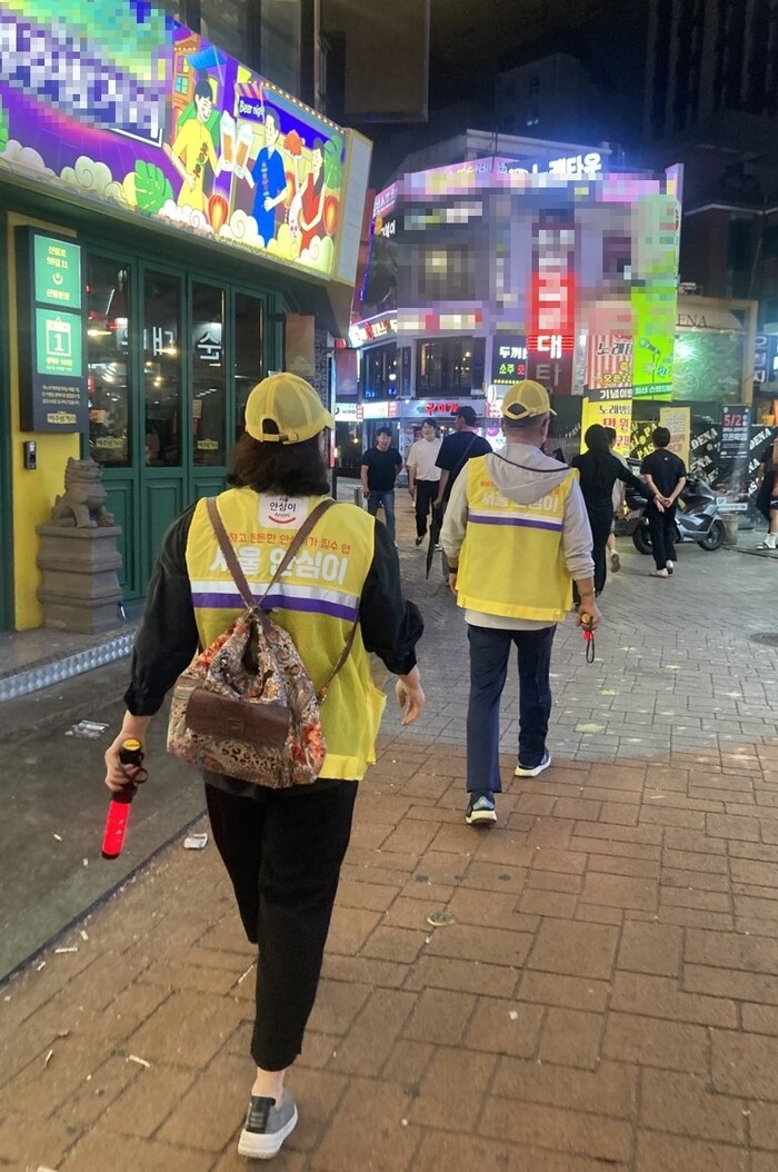 ▲ 신림역 일대에서 활동하고 있는 안심귀가 스카우트 모습. 관악구 제공 |