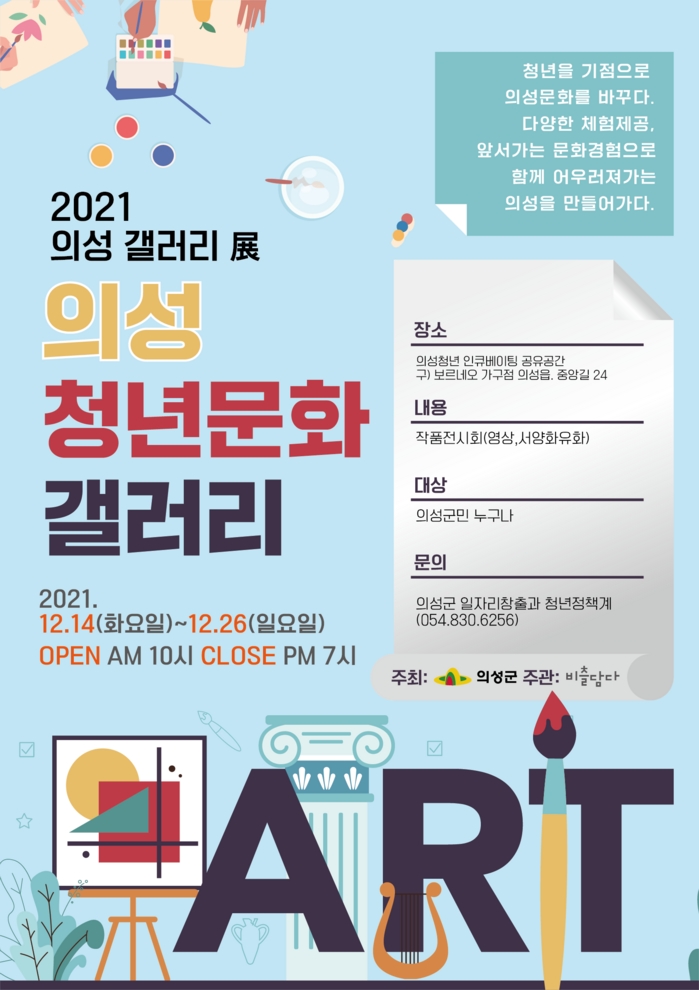 [로컬세계 박상진 기자]경북 의성군은 연말연시를 예술과 함께 청년-주민과 어우러져가는 의성으로 만들어 가고자 의성읍 도동리 소재 청년기반 인큐베이팅 공유공간에서 오는 14일부터 26일까지 의성 청년문화 갤러리 전(展)을 개최한다고 13일 밝혔다.