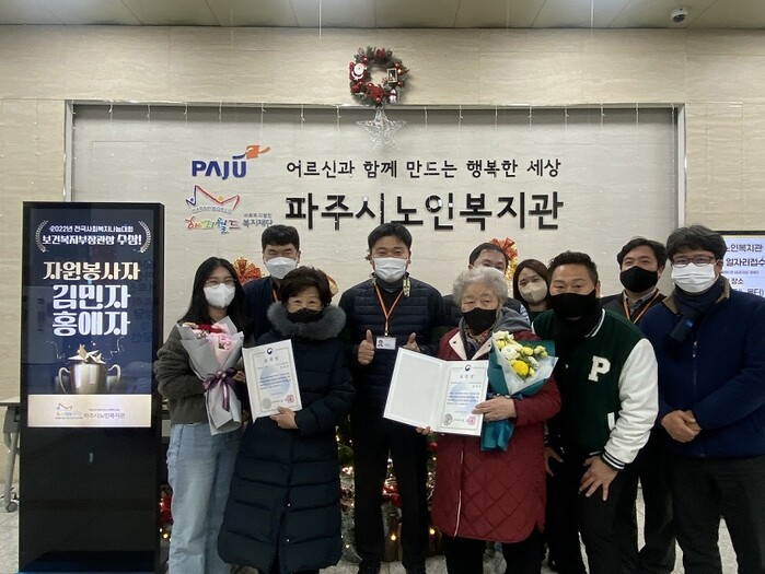 [로컬세계 = 이영원 기자]경기 파주시는 지난 7일 파주시노인복지관 자원봉사자인 김민자, 홍애자씨가 보건복지부와 한국사회복지협의회에서 주최하는 제22회 전국사회복지나눔대회 자원봉사자부문에서 보건복지부장관상을 수상했다고 14일 밝혔다.