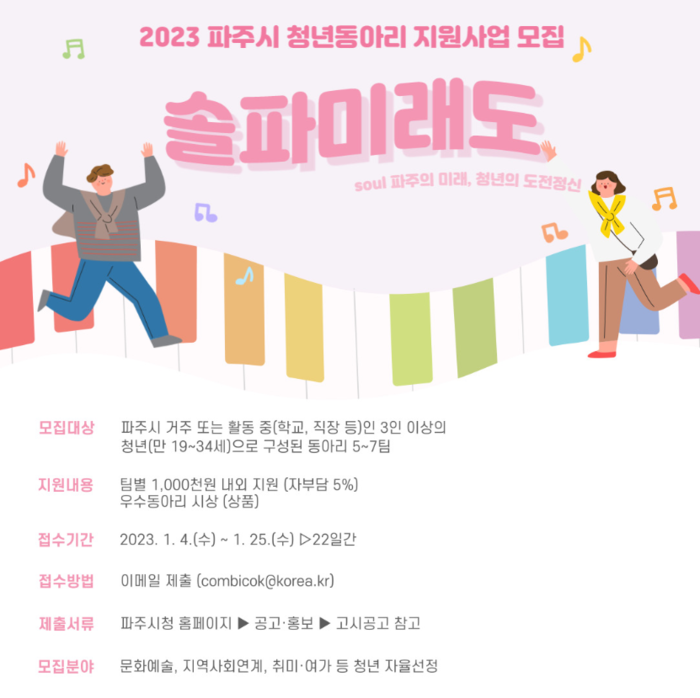 신청 대상은 파주시에 거주하거나 활동하는 만 19세부터 만 34세 청년 3명 이상으로 구성된 동아리다.