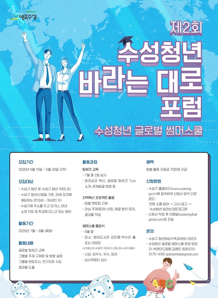 [로컬세계 박세환 기자]대구 수성구는 오는 30일까지 제2회 수성청년 바라는대로 포럼 ‘수성청년 글로벌 썸머스쿨’의 참여자를 모집한다고 16일 밝혔다.
