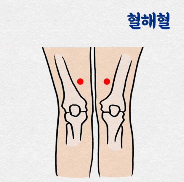 무릎 통증 완화에 좋은 지압법 중 하나로는 ‘혈해혈(血海穴)’ 지압이 있다. 혈해혈은 무릎을 굽혔을 때 중앙에 튀어나와 있는 뼈인 무릎뼈바닥의 안쪽 끝에서 손가락 두 마디 정도 위에 위치한다. 이름 그대로 ‘혈액의 바다’ 역할을 하는 혈자리로 엄지로 20초간 지압을 10회 반복하면 무릎으로 향하는 혈행이 개선되는 효과가 있다.