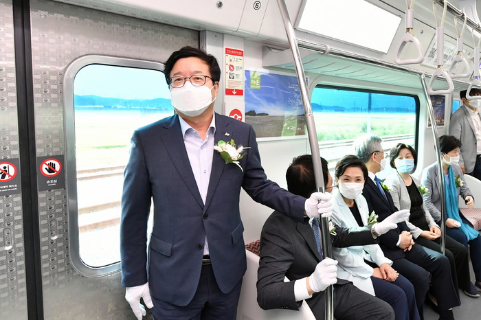 | ▲지난해 9월10일 수인선 개통식에서 염태영 수원시장이 수인선 열차를 탑승하고 있다. 수원시 제공 |