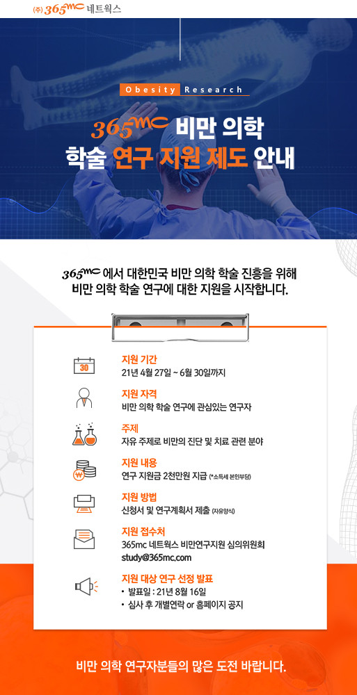 365mc는 지원제도를 통해 비만의 진단 및 치료관련 분야 연구자를 모집해 선정한 후, 연구지원금 2000만원을 지원할 계획이다. 비만 의학 학술 연구에 관심있는 연구자라면 누구나 365mc네트웍스 비만 연구지원 심의위원회를 통해 지원 가능하며 지원기간은 오는 6월 30일까지다.