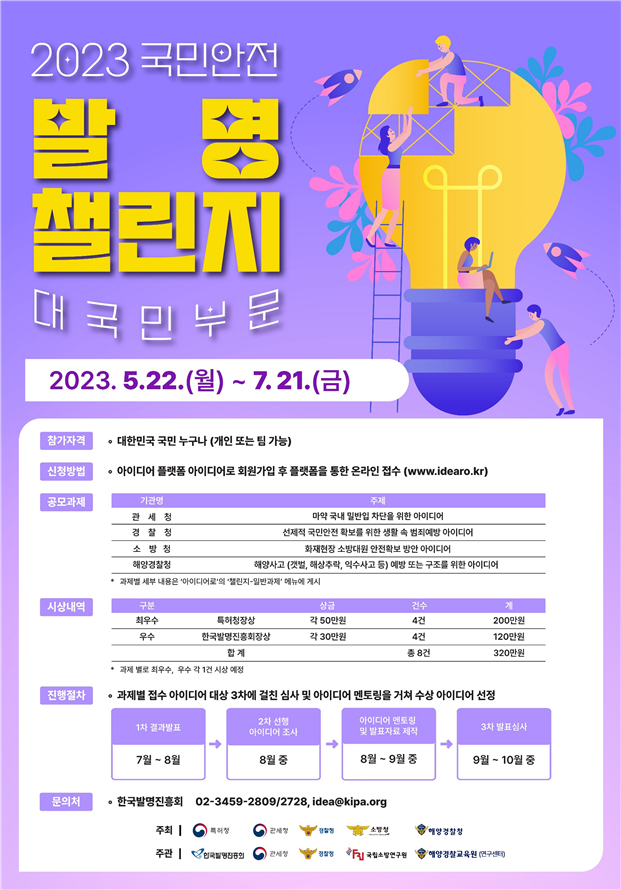 관세청(청장 윤태식)은 특허청,경찰청,소방청, 해양경찰청과 함께 오는 7월 21일까지 '2023 국민안전 발명챌린지' 대국민 아이디어 접수를 시작한다고 22일 밝혔다.