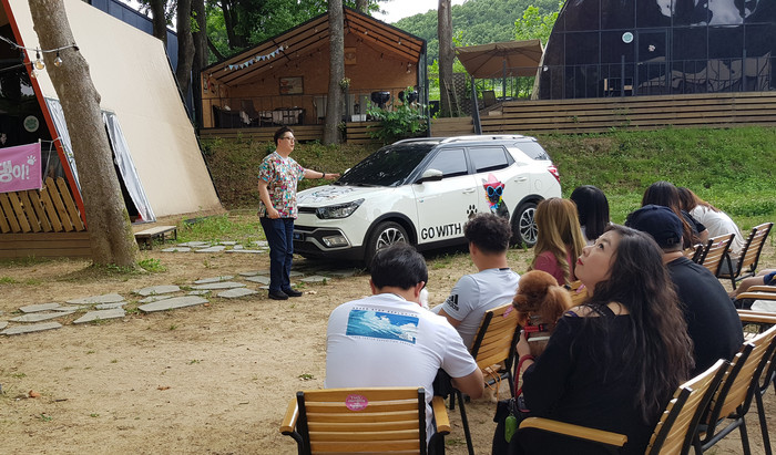 ▲최인영 수의사가 반려견과의 안전한 자동차생활을 위한 펫 드라이빙에 대해 교육하고 있다. |