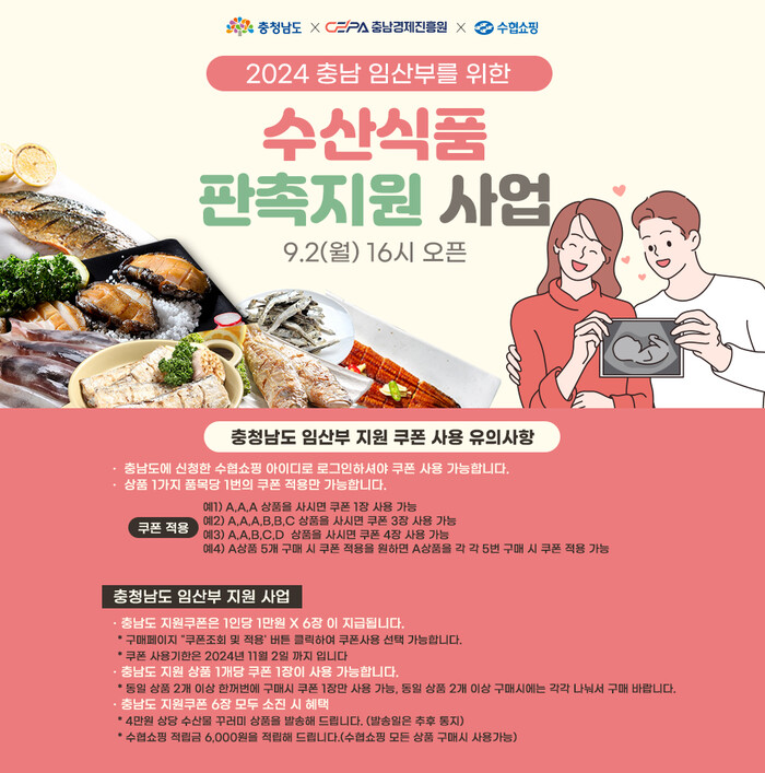 수협중앙회 직영 쇼핑몰 수협쇼핑이 충청남도 및 충남경제진흥원과 함께 ‘2024 충남 수산식품 임산부 대상 수산물 판촉(꾸러미) 지원사업’을 추진한다.