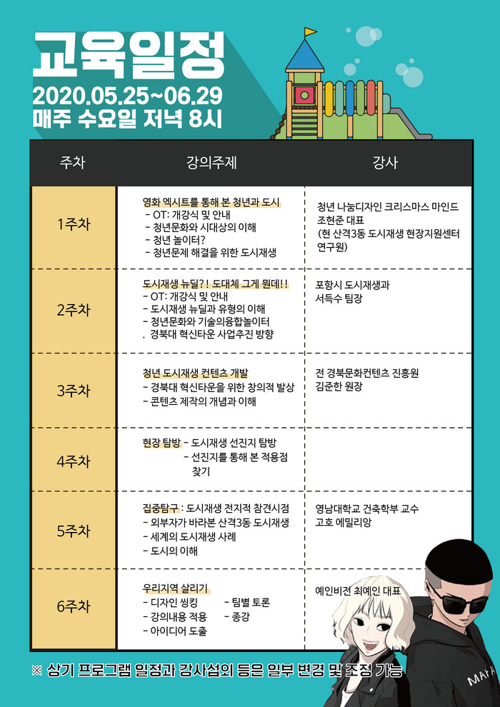 이번 도시재생 대학은 도시재생 뉴딜사업 “청년문화와 기술의 융합 놀이터 경북대 혁신타운” 사업의 일환으로 ‘청년 꿈 대안대학교’ 아이앤지 캠퍼스에서 민간위탁에 따른 수탁기관으로 선정되어 진행한다.