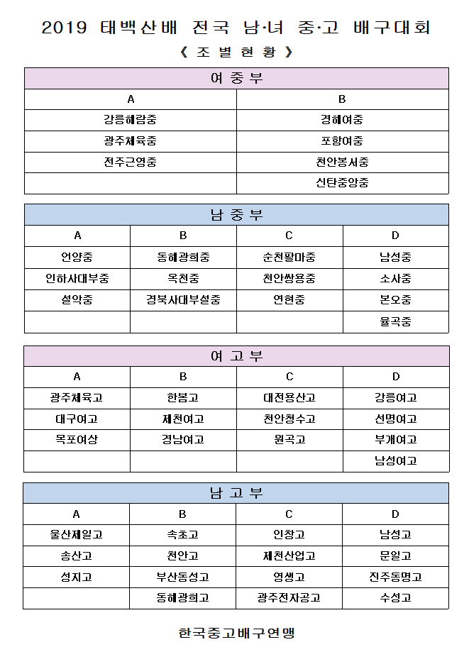 ▲2019 태백산배 전국 남녀 중고 배구대회 조별현황.(출처=한국배구중고연맹) |