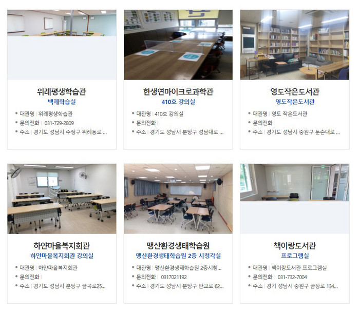 | ▲‘배움숲’ 성남시 평생학습 포털에 게시된 공간공유 참여 기관·시설들. |