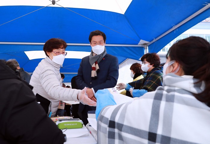 ▲지난 15일 류태호 시장이 코로나19 이동 예방접종센터를 방문해 현장상황을 점검하고 있다. 태백시 제공 |