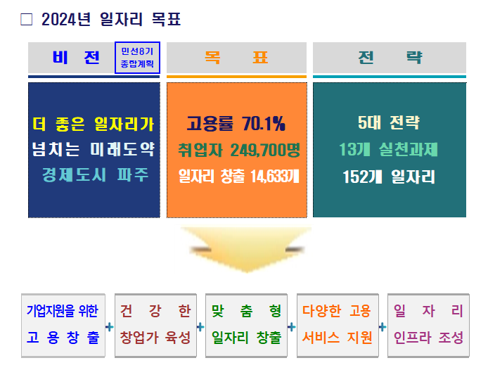 올해 파주시 일자리 목표는 고용률(15~64세) 70.1%, 취업자 수 24만 9,700명으로 지난해 대비 고용률은 0.4%p, 취업자 수는 3.2% 높인 수치다.