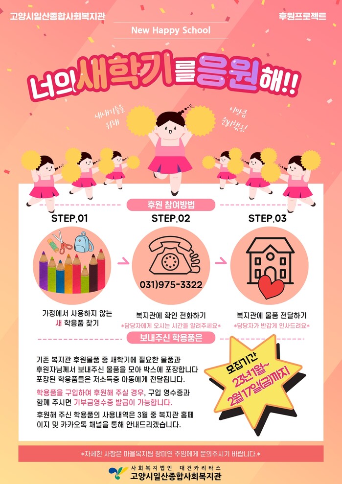 [로컬세계 = 이영원 기자]경기 고양시 일산종합사회복지관에서 새학기를 맞아 오는 16일부터 2월 17일까지 학용품 나눔 캠페인 ‘너의 새학기를 응원해’를 진행한다.