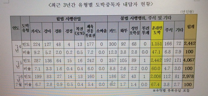 조승래 의원(더불어민주당‧국회 교육문화체육관광위원회)이 한국도박문제관리센터에서 제출받은 자료에 따르면 도박중독 상담을 위해 방문한 이가 2014년 2442명에서 2015년 4067명, 올 7월 기준 2978명에 달했다. 올해 방문자가 5000명을 넘어설 것으로 예상되는 등 3년간 내담자가 늘어나고 있다.