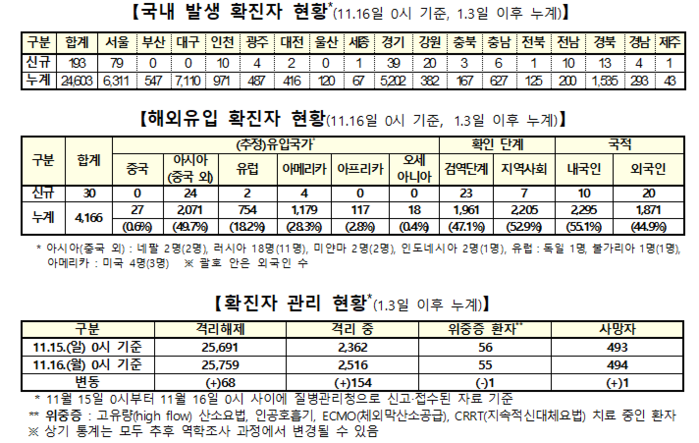 질병관리청 중앙방역대책본부(본부장:정은경 청장)는 16일 0시 현재, 국내발생 신규 확진자는 193명이 확인됐고, 해외유입은 30명이 확인돼 총 누적 확진자수는 2만8769명(해외유입 4166명)이라고 밝혔다.