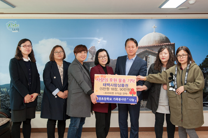 이번 기탁한 태백사랑상품권은 가족봉사단이 지난 14일 상장초등학교 체육관에서 개최한 프리마켓에서 아이들이 고사리 손으로 판매해 모은 수입금이다.