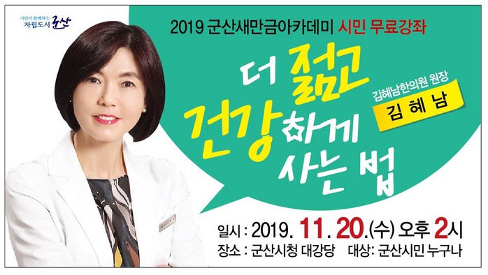 또한 새로운 지식과 정보습득 기회를 제공하고 시민의 긍정적인 의식변화를 통해 지역발전을 도모하기 위해 실시하고 있는 2019 군산새만금아카데미 마지막 강좌를 오는 20일 오후 2시 군산시청 대강당에서 김혜남 한의사를 초청하여 '더 젊고 건강하게 사는 법'이란 주제로 개최한다.
