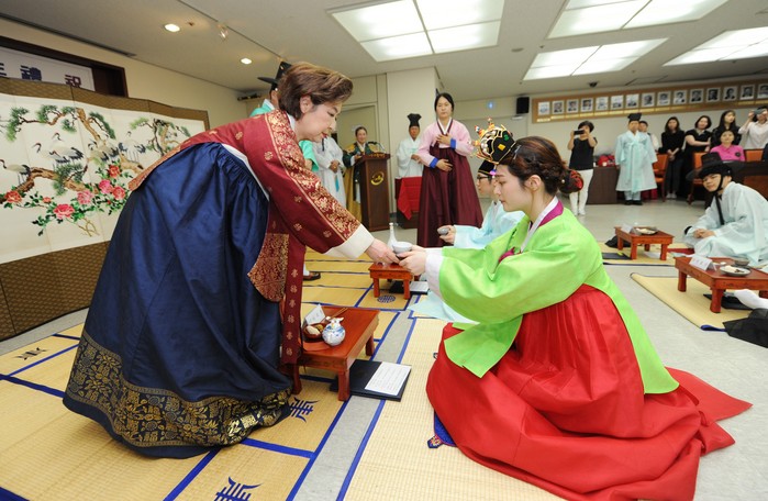 ▲20일 제8회 동대문구 전통 성년례의식 재연 행사에서 큰손님으로 참가한 동대문구 이영순 건강가정 센터장이 성년자에게 술을 내리고 있다. |