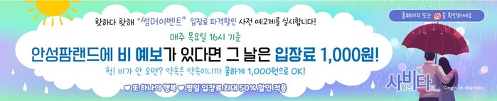 이번 프로모션은 이벤트 기간에 비 예보가 있으면 안성팜랜드를 천원에 입장할 수 있으며, 매주 목요일 오후 4시 일기예보를 기준으로 할인 입장 가능한 날을 일주일 단위로 홈페이지에 사전 공지한다. 공지한 날 당일 비가 오지 않더라도 천원 입장이 가능하다.