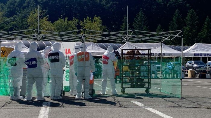 ▲고병원성에서 조류인플루엔자(AI) 가상방역현장훈련을 실시하고 있다. 태백시 제공 |