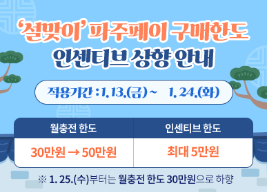 [로컬세계 = 이영원 기자]경기 파주시(시장 김경일)는 설 명절을 맞아 13일부터 24일까지 지역화폐인 ‘파주페이’의 인센티브 지급한도를 30만원(3만원)에서 50만원(5만원)으로 상향했다.
